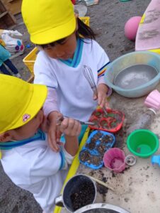 お砂場にある、容器や型抜きやスコップを使って・・・