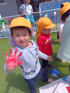 手のひらに絵具がついても、楽しくなってきたよ!!