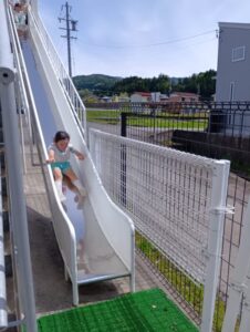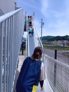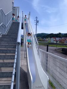 そして今日は、園舎横にある非常階段とすべり台を滑ってみました。
